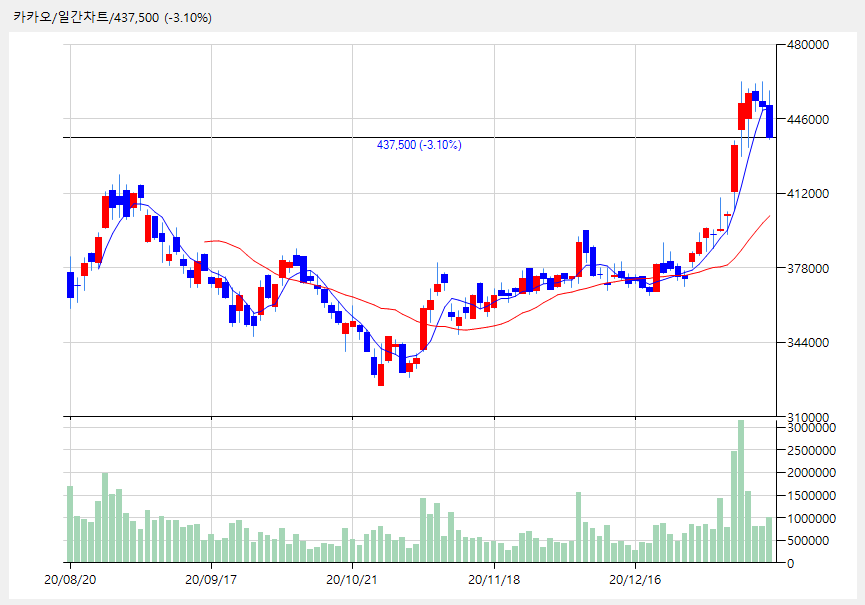 카카오 437,500 (-14,000, -3.10%)