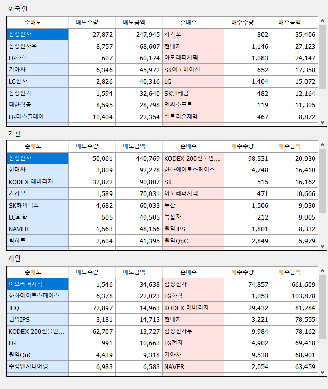 매매상위(외국인/기관/개인) : 투자자별 매매 상위 종목