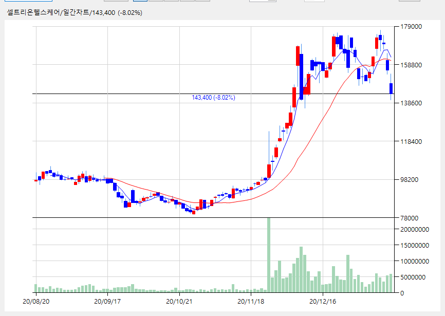 코스닥 시가총액 1위인 셀트리온헬스케어 143,400 (-12,500, -8.02%) 는 요 며칠 계속 하락 중입니다.
