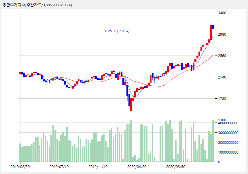 코스피 주간차트로 보면 특히 지난주가 얼마나 많이 상승했는 지 잘 보입니다