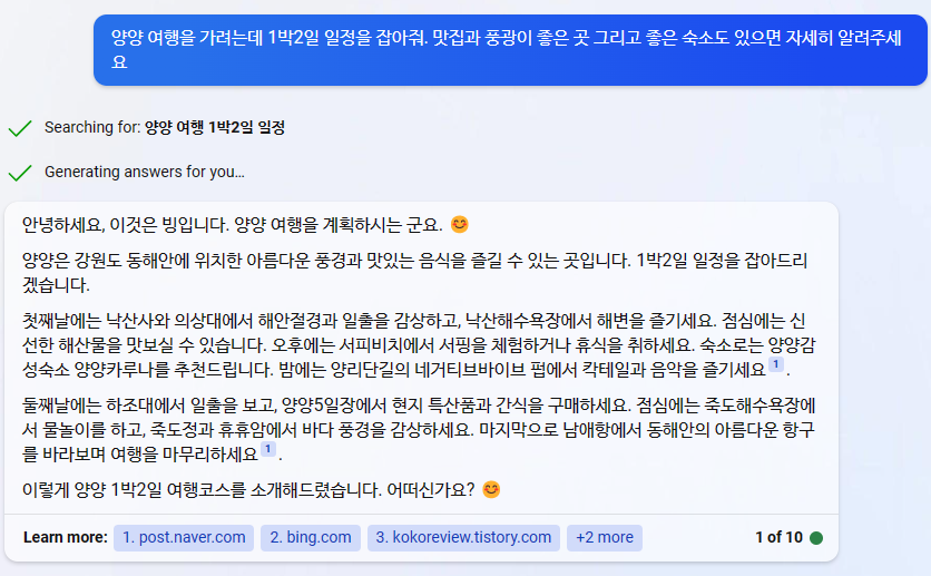 양양 1박2일 일정에 대해서 질의해 봤습니다