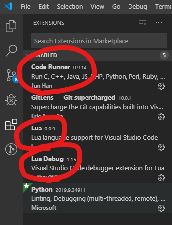 2. 확장 기능에 Code Runner, Lua, Lua Debug를 설치하자