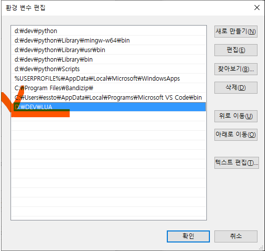 3. 시스템 속성창에서 환경 변수 Path에 Lua 실행파일의 위치를 추가한다.