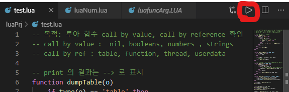 새로운 루아 파일을 작성하고 Code Runner 를 통해 실행한다 (시스템 속성의 Path에서 Lua.exe를 찾아 해당 파일을 실행해 준다)