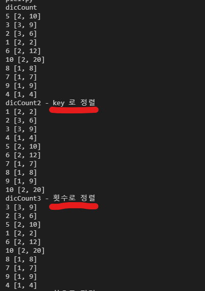 # 정렬 방식 : dicCount 를 value[0] 를 이용해 정렬