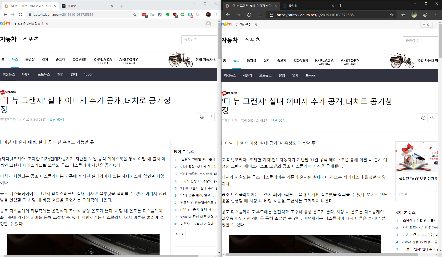왼쪽이 기존 크롬, 우측은 엣지