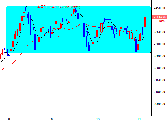 코스피 일간차트 기준으로는 8월 부터 코스피 2250 근처에서 지저선을, 2400 근방에서 저항 중이라, 요번엔 뚫고 갈지 궁금