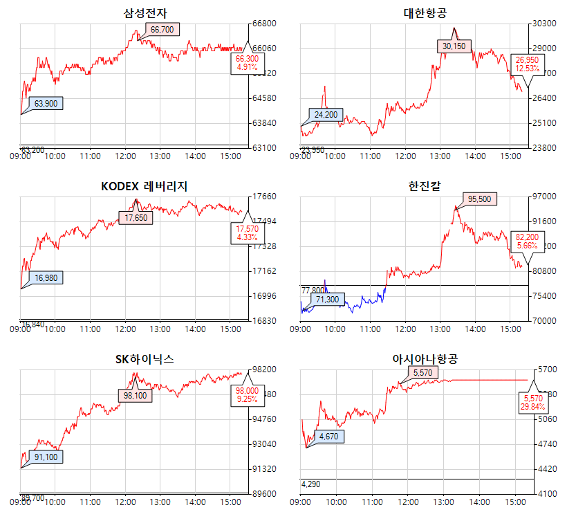 대한항공의 아시아나 인수 소식에 대한항공과 아시아나 관련주의 움직임이 큰 하루였습니다.