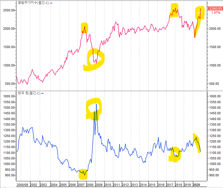 위 그림에서 보듯, 환율과 코스피는 반대 방향으로 움직인 경우가 많습니다.