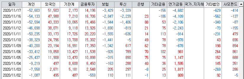 11월 들어 외국인은 누적 5조 15백억이나 매수를 하였고 개인은 반대로 5조 2천억를 매도했네요