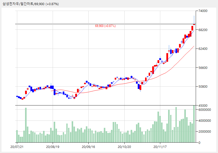 개인순매수 1위를 차지한 삼성전자우는 장중한 때 급등했다가 69,900원으로 마감했습니다.