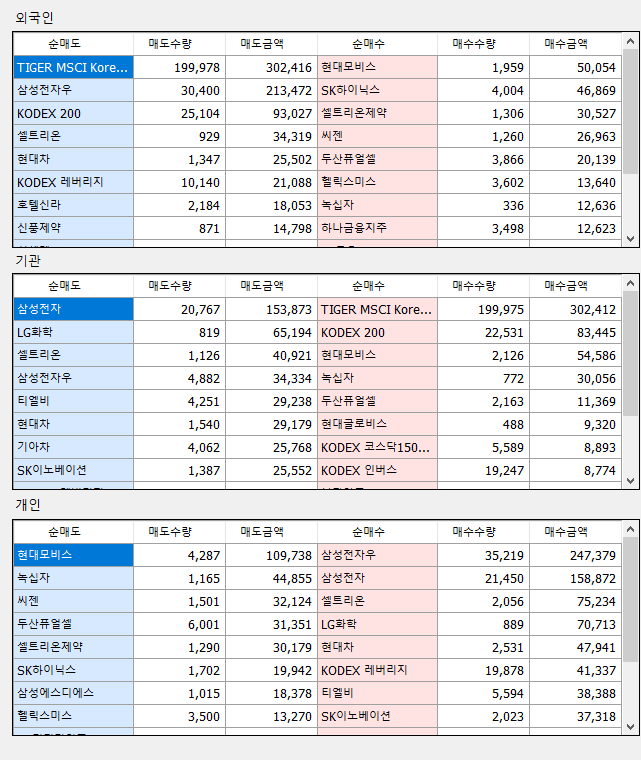 매매상위(외국인/기관/개인) : 투자자별 매매 상위 종목