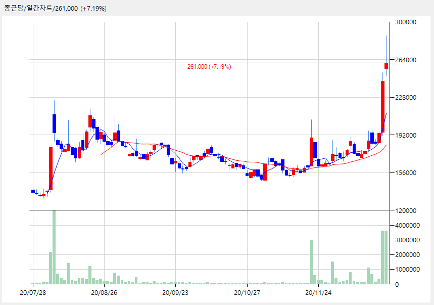 거래소 거래대금 4위: 종근당 261,000 (+17,500, +7.19%) 차트