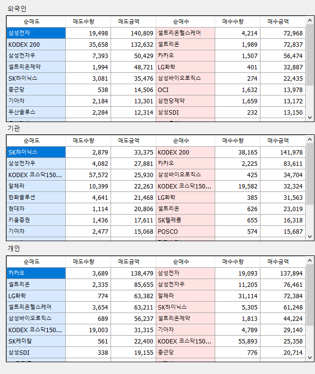 매매상위(외국인/기관/개인) : 투자자별 매매 상위 종목