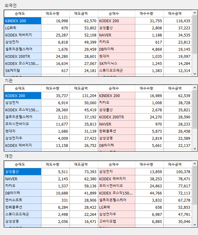 매매상위(외국인/기관/개인) : 투자자별 매매 상위 종목