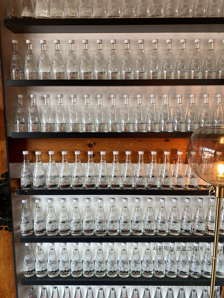 출입구에 진열된 수 많은 에비앙 생수병들 (이 곳은 모든 커피와 음료를 에비앙 생수로 만든다고)