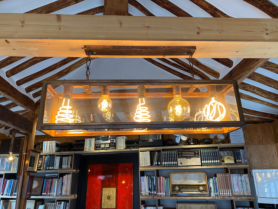전구들이 파이프라인처럼 개별로 올라가 설치 되어 있는 독특한 인테리어