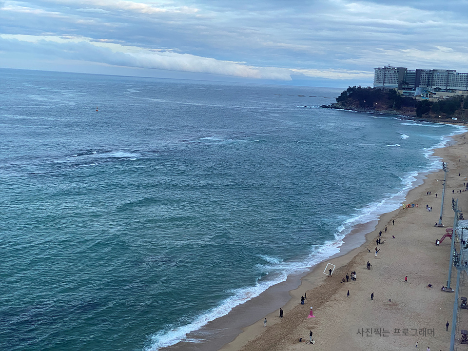 속초 해수욕장과 하늘이 보입니다. 우측 끝에는 롯데 속초 리조트가 보이네요