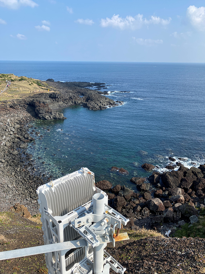 등대에 올라 주위를 둘러봅니다. 파란 하늘과 바다, 제주의 검은 화산 바위가 장관입니다