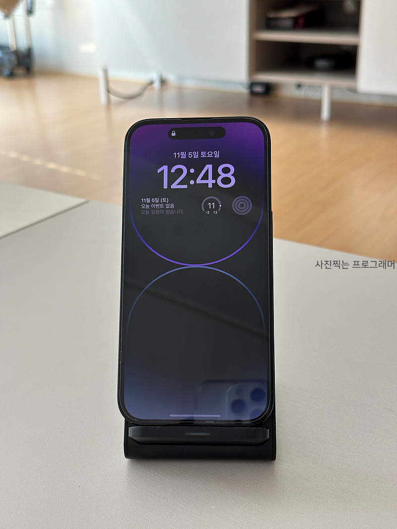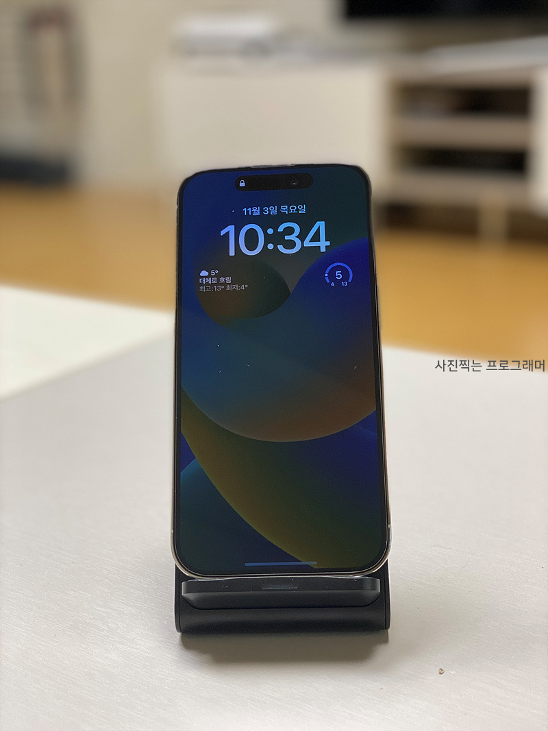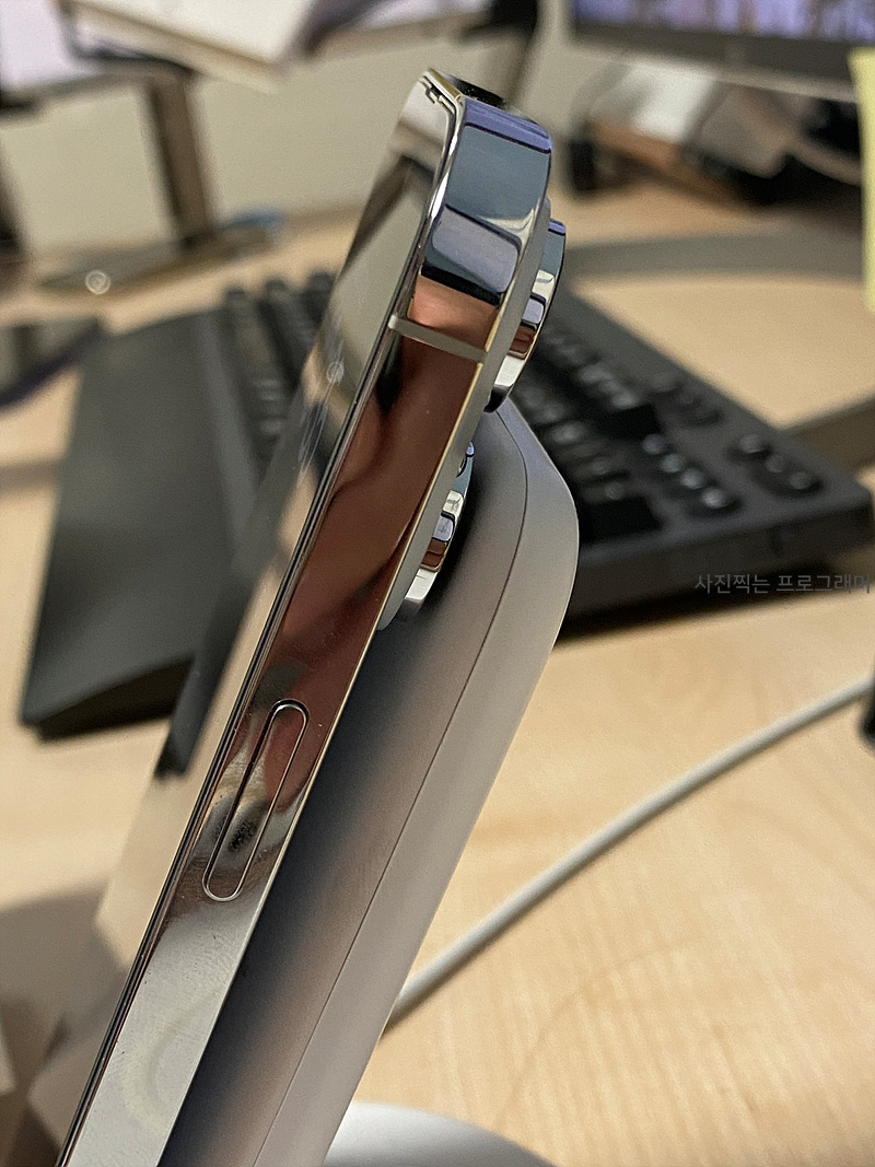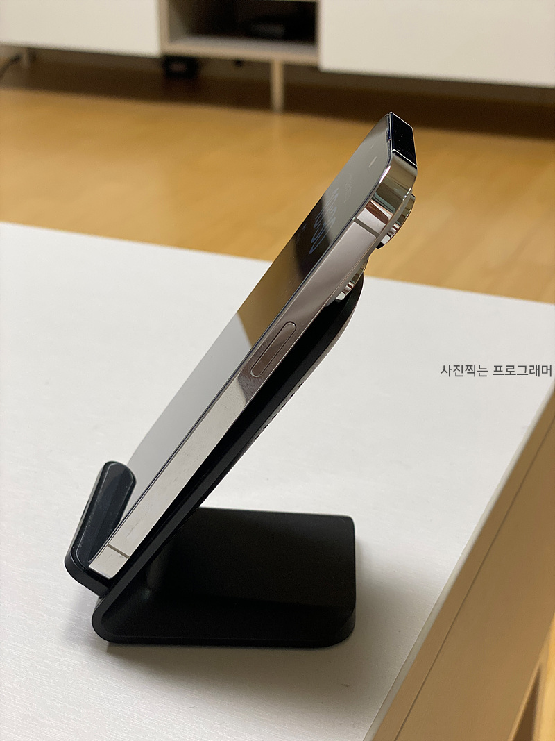 무선 충전기에 거치할 때 카메라 때문에 유격이 조금 생기지만 다행히 충전은 문제없이 잘 됩니다