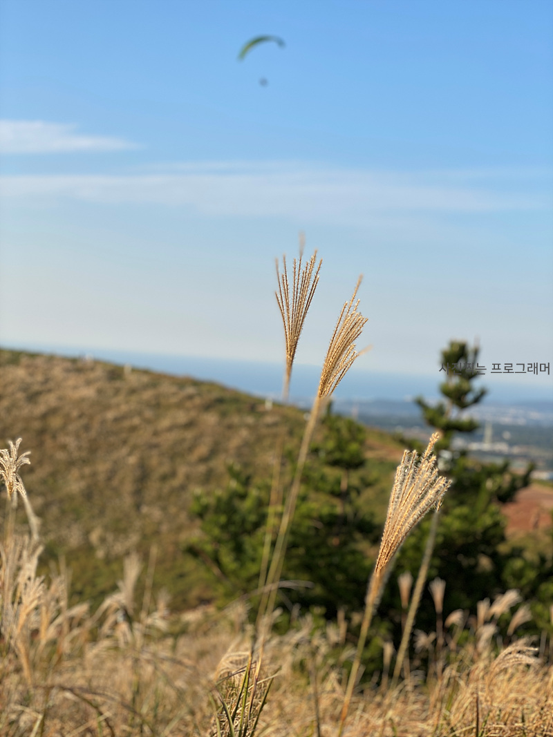 금오름에 오르고 보니 패러글라이딩을 바로 눈앞에서 볼 수 있네요