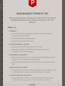 Press2 Press 1.2 업데이트(안드로이드 RSS 리더 앱) 오랜만에 안드로이드 뉴스 리더 앱Press 에 큰 업데이트가 추가되었는데, 이번 업데이트로 그 동안 불만이었던 2 가지 느린 속도 불편한 기사 네비게이션 이 모두 해결 되어 대 만족입니다. 그 동안 Press 의 기사 네비게이션 방법은 기사 하단에 있는 화살표를 누르는 방법 밖에 없었습니다. 이 방법으로는 한 손으로 폰을 잡으면서 동시에 기사를 보기엔 불편한 UI 였던 게 사실입니다. 구글 RSS 나 피들리(Feedly) 같은 다른 무료 앱들이 좌/우 스와이프 제스처를 잘 지원하고 있기 때문에 더욱 Press 를 사용할 때마다 불편하게 느껴졌는데요 이번 업데이트로 설정 > Article Navigation 메뉴에 스와이핑 방향을 지정하는 기능이 추가되었습니다. 기본은 세로 스와이핑인데 이 경우 기사를 읽.. 2013. 4. 18. 안드로이드 구글 RSS 리더 앱 - Press 안드로이드를 쓰면서 늘 부족하다고 느꼈던 프로그램이 RSS 리더 앱이었습니다. 아이폰을 사용할 때는 Reeder 라는 멋진 RSS 리더 앱이 있어서 즐겨 사용했는데 안드로이드에서는 그 대체 앱을 찾기가 힘들었습니다. (이미지 출처: 아이튠즈 Reeder 앱) 그러다 발견한 앱이 Press 입니다. 처음에는 사용 동영상을 보고 혹해서 구입했는데, 동영상은 지금 봐도 정말 잘 만들었습니다. Press App from Tyler Hoff on Vimeo. 하지만 초창기 Press 는 많은 부분이 부족했습니다. 특히 다음 뉴스를 가져오기 위해서는 항상 목록으로 이동 > 다음 글 클릭이라는 아주 불편한 방식만 지원했거든요. 많은 글을 읽어야 하는 상황에서 이 문제 때문에 잘 사용하지 않고 있었는데 지난 18일 아.. 2013. 1. 24. 이전 1 다음